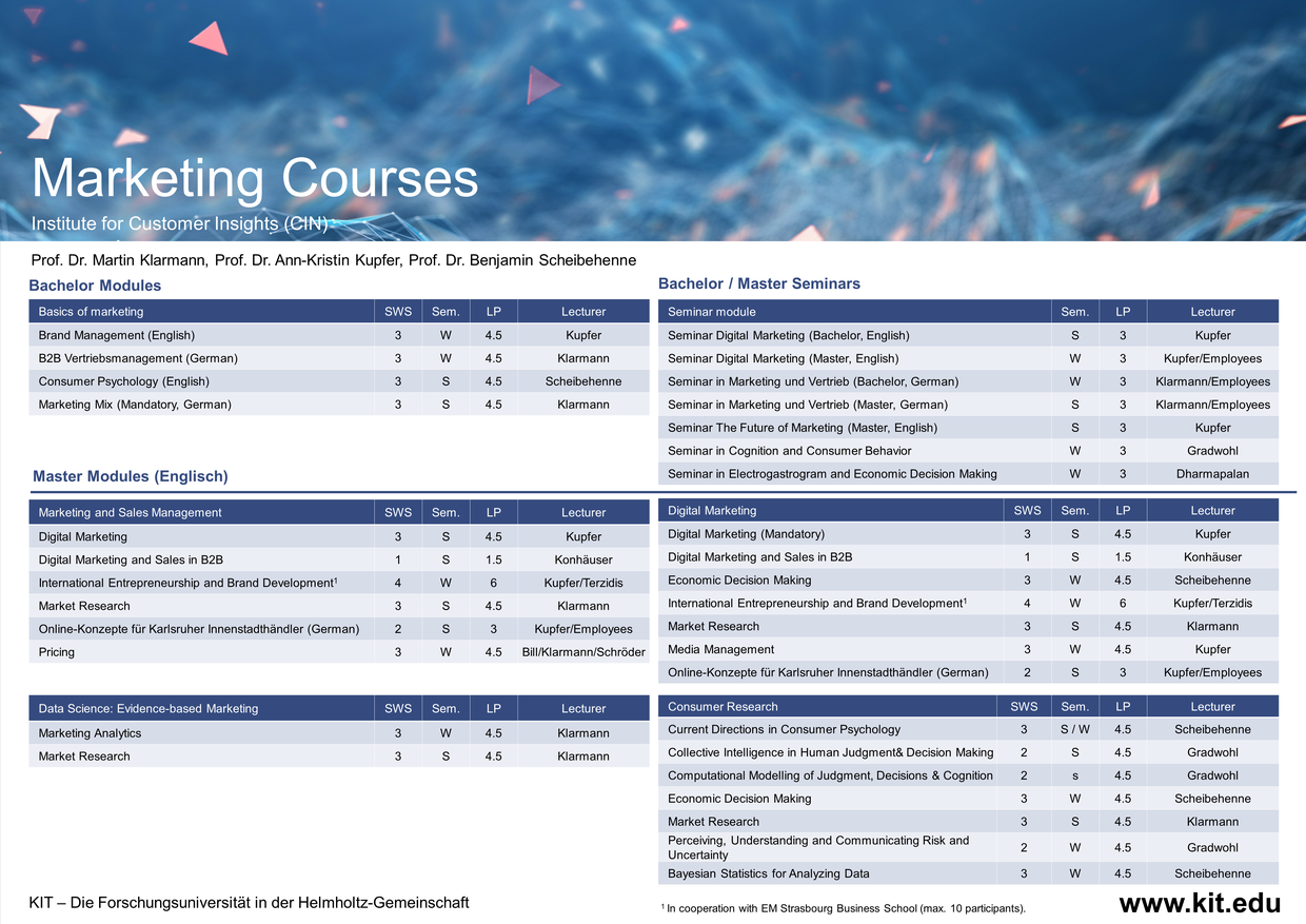 | WS 25/26 | Brand Management Exercise | Practice (Ü) | 1 | Prof. Dr. Ann-Kristin Kupfer Mitarbeiter/Innen KIT |
