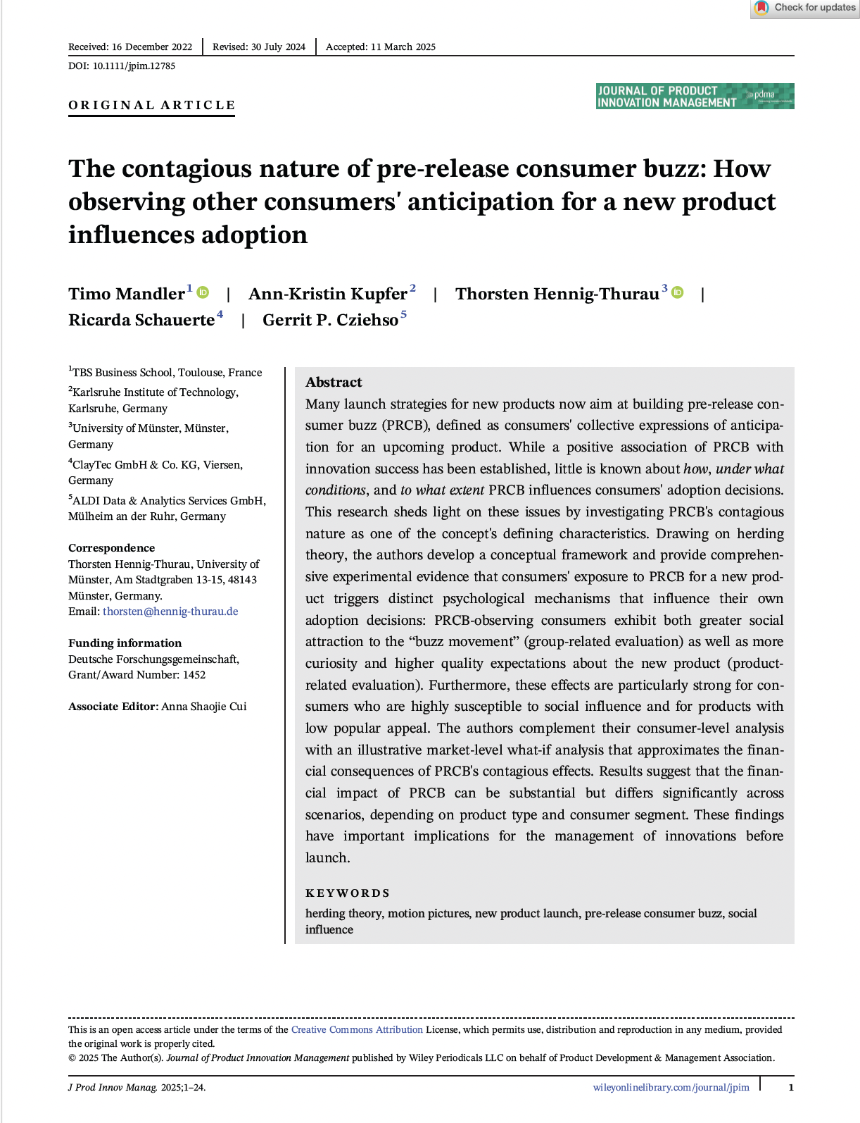 Mandler, Timo, Ann-Kristin Kupfer, Thorsten Hennig-Thurau, Ricarda Schauerte, and Gerrit P.Cziehso (2025): The Contagious Nature of Pre-Release Consumer Buzz: How Observing Other Consumers' Anticipation for a New Product Influences Adoption, Journal of Product Innovation Management, 42, forthcoming. | Houston, Mark, Ann-Kristin Kupfer, Thorsten Hennig-Thurau, and Martin Spann (2018): Pre-Release Consumer Buzz, Journal of the Academy of Marketing Science, 46 (2), 338–360. [Recipient of the JAMS Best Paper Award] | Kupfer, Ann-Kristin, Nora Pähler vor der Holte, Raoul V. Kübler, and Thorsten Hennig-Thurau (2018): The Role of the Partner Brand’s Social Media Power in Brand Alliances, Journal of Marketing, 83 (3), 25-44. | Mandler, Timo, Cziehso, Gerrit P., Schaefers, Tobias, Kupfer, Ann-Kristin, & Mafael, Alexander (2024). This article is… Consumer reactions to unfinished teasers for digital content. Psychology & Marketing. |
