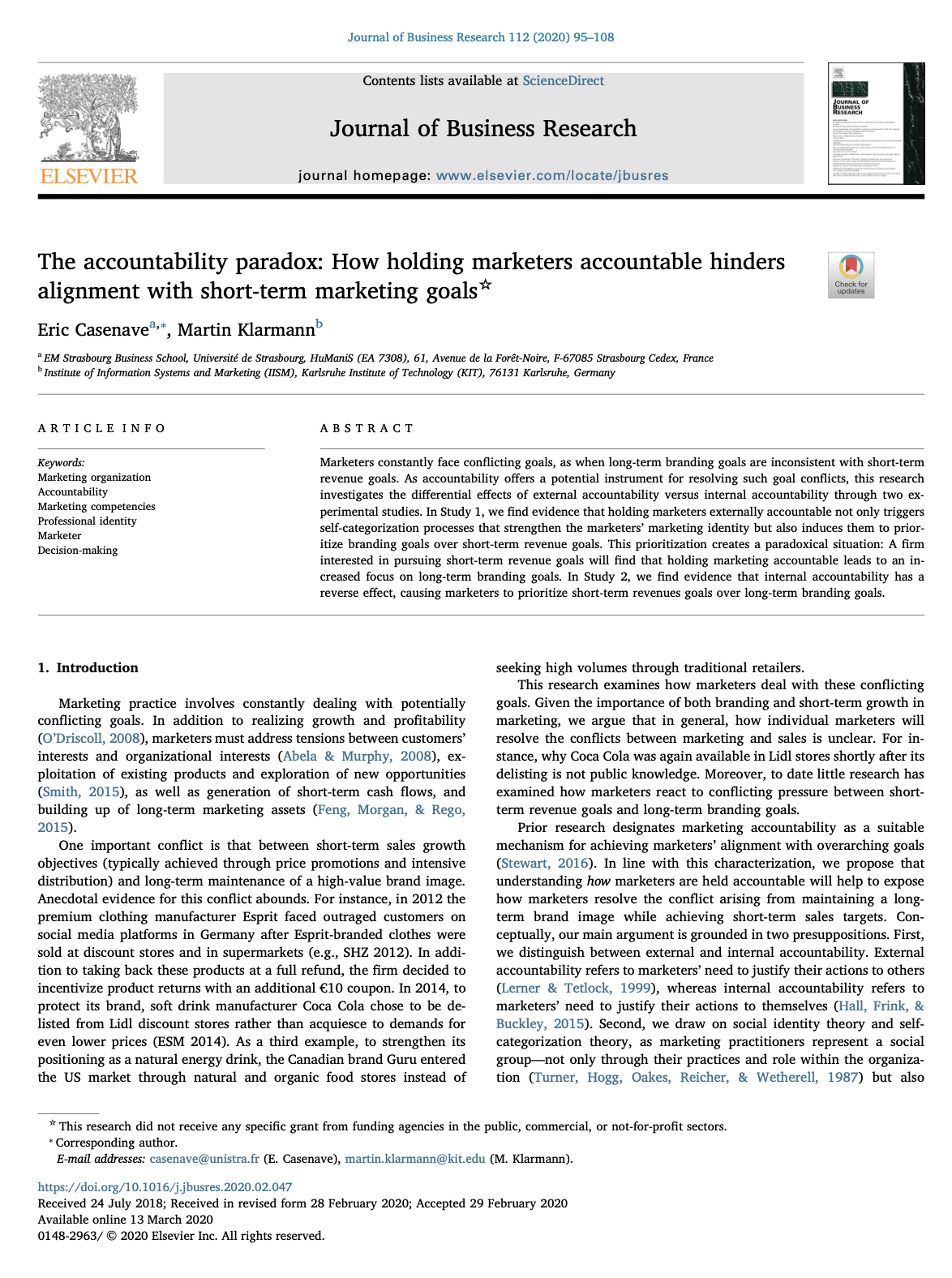 Casenave, Eric and Martin Klarmann (2020) "The Accountability Paradox: How Holding Marketers Accountable Hinders Alignment with Short-term Marketing Goals", Journal of Business Research, 112 (May), 95-108. |
