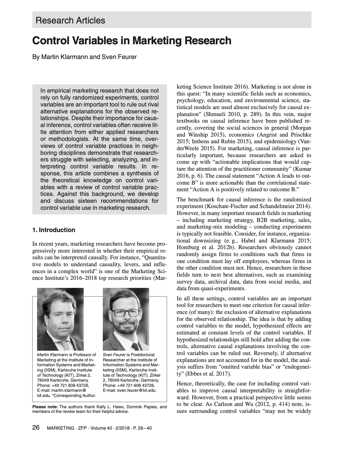 Klarmann, Martin and Sven Feurer (2018), "Control Variables in Marketing Research," Marketing ZfP - Journal of Research and Management, 40 (2), 26-40. |