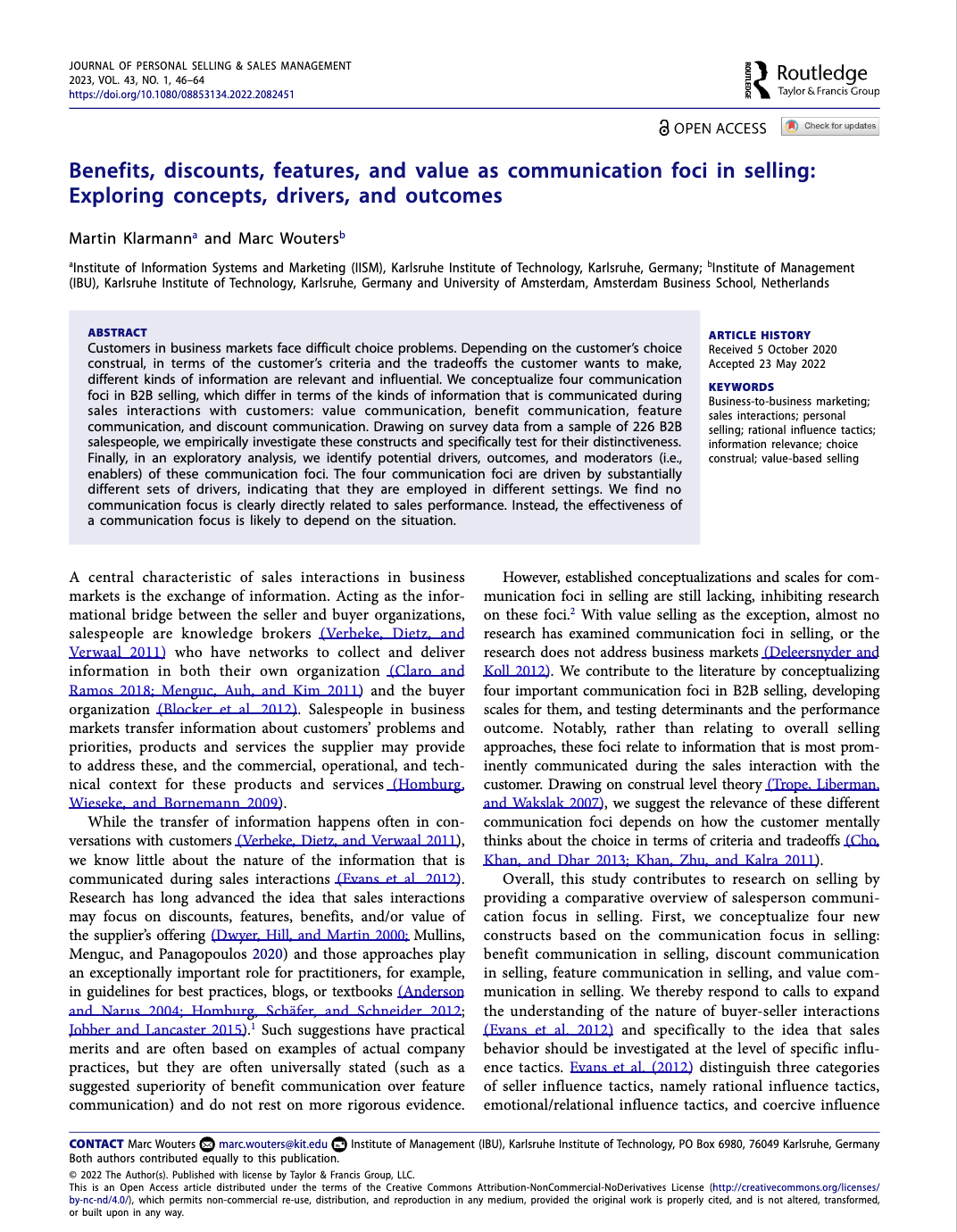 Martin Klarmann, and Marc Wouters (2022), Benefits, Discounts, Features, and Value as Communication Foci in Selling: Exploring Concepts, Drivers, and Outcomes,” Journal of Personal Selling and Sales Management, 43 (1), 46-64. |