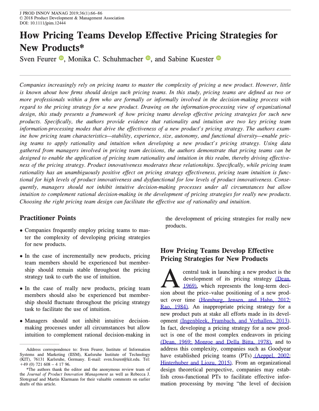 Sven Feurer, Monika C. Schuhmacher & Sabine Kueste, How pricing teams develop effective pricing strategies for new products, Journal of Product Innovation Management (2019) |